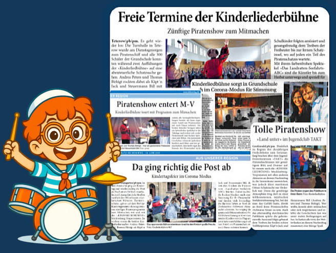 29.01. 2 x in Ribnitz-Damgarten30.01. 2 x im Landkreis Vorpommern Greifswald05.02. Fischland Darß11.02. 2 x in Hamburg12.02. Lübeck14.02. 2 x in Kiel27.02. Landkreis Rostock 28.02. 3 x im Landkreis Nordwestmecklenburg01.03. Insel Usedom19.03. Waren31.03. Bützow02.04. Neubrandenburg03.04. Insel Usedom06.05. Greifswald07.05. Neubrandenburg17.05. Landkreis Vorpommern-Rügen24.05. Landkreis Mecklenburgische-Seenplatte02.06. 2 x im Landkreis Rostock03.06. Landkreises Ludwigslust-Parchim05.06. Landkreis Mecklenburgische-Seenplatte10.06. Elbe-Elster11.06. 2 x Potsdam-Mittelmark19.06. Teltow-Fläming24.06. Dahme-Spreewald25.06. 2 x Oder-Spree27.06. Landkreis Ludwigslust-Parchim 01.07. Vorpommern-Greifswald02.07. Vorpommern-Greifswald04.07. 2 x Neubrandenburg14.07. 2 x Stralsund22.07. Piratenfest Bad Doberan23.07. 2 x Rostock24.07. Insel Rügen25.07. 2 x Berlin Prenzlauer Berg28.07. 2 x Berlin Friedrichshain-Kreuzberg29.07. 2 x Berlin Charlottenburg-Wilmersdorf07.08. Prenzlau 11.08. Pasewalk12.08. Landkreis Mecklenburgische-Seenplatte16.08. 2 x Vorpommern-Greifswald10.09. Insel Rügen23.09. 2 x im Landkreis SaalekreisEin herzliches Dankeschön für den wunderbaren Frühstücksempfang und die liebevoll gestalteten Töpferarbeiten der Kinder in Mücheln zum »Tag der Zahngesundheit 2025«.24.09. Landkreis Saalekreis25.09. 2 x Teltow-Fläming26.09. 2 x Dahme-Spreewald29.09. Landkreis Vorpommern-Rügen30.09. Landkreis Mecklenburgische-Seenplatte01.10. Insel Usedom02.10. 2 x Insel Usedom06.10. 2 x Dresden08.10. Saale-Orla-Kreis09.10. 2 x Saale-Orla-Kreis07.11. 2 x Landkreis Ludwigslust-Parchim10.11. Neustrelitz11.11. 2 x Waren (Müritz)19.11. Landkreis Ludwigslust-Parchim20.11. Landkreis Rostock21.11. 2 x Landkreis Rostock27.11. Landkreis Nordwestmecklenburg29.11. Insel Rügen01.12. 2 x Elbe-Elster02.12. 2 x Elbe-Elster03.12. Landkreis Mecklenburgische-Seenplatte04.12. 2 x Landkreis Ludwigslust-Parchim05.12. Landkreis Mecklenburgische-Seenplatte08.12. Insel Rügen09.12. Landkreis Vorpommern-Rügen10.12. Grimmen11.12. Insel Rügen16.12. Insel Rügen18.12. 2 x Strasburg (Uckermark) 19.12. Landkreis Ludwigslust-Parchim